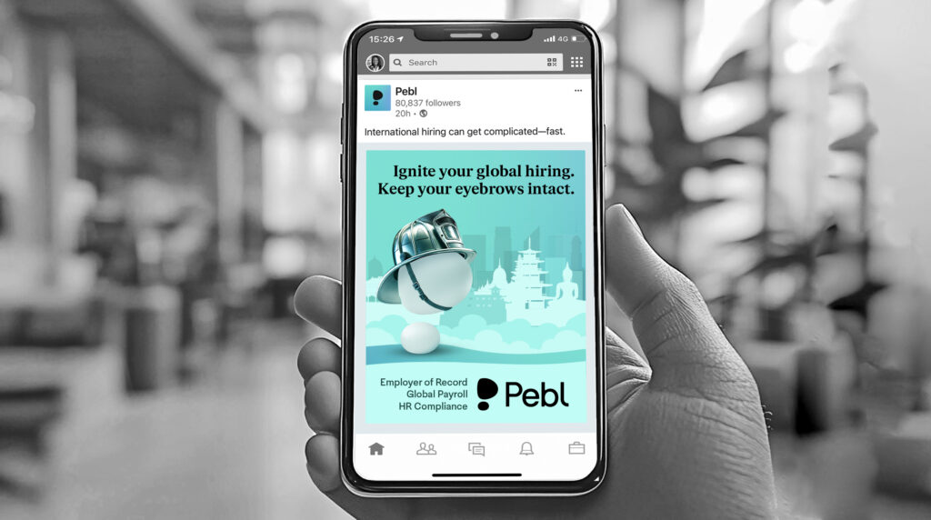 CHALLENGE: Pebl needed to make a big “splash” in the HR space. We needed to build awareness among HR leaders navigating the complexity of hiring across borders. With compliance, payroll, and employment regulations varying by country, global hiring can quickly become overwhelming. The objective was to drive qualified leads while positioning Pebl as the modern and easy way for companies to hire and manage talent worldwide.