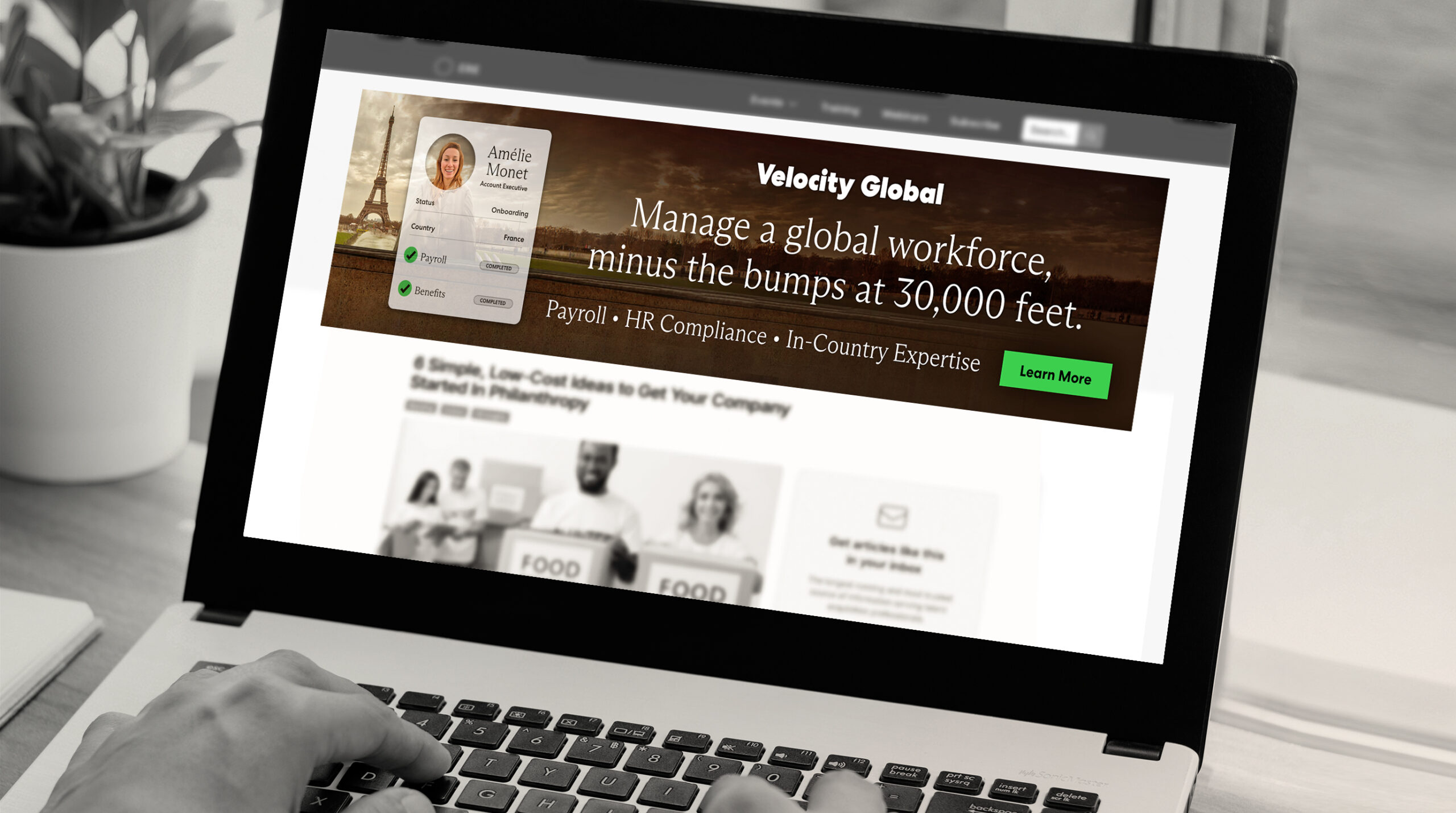 CHALLENGE: Velocity Global wanted to increase awareness among HR managers responsible for global hiring. As global hiring grows, HR leaders face complex compliance, payroll, and employment regulations in multiple countries. The goal was to drive website traffic and qualified leads while positioning Velocity Global as the simplest way to hire.