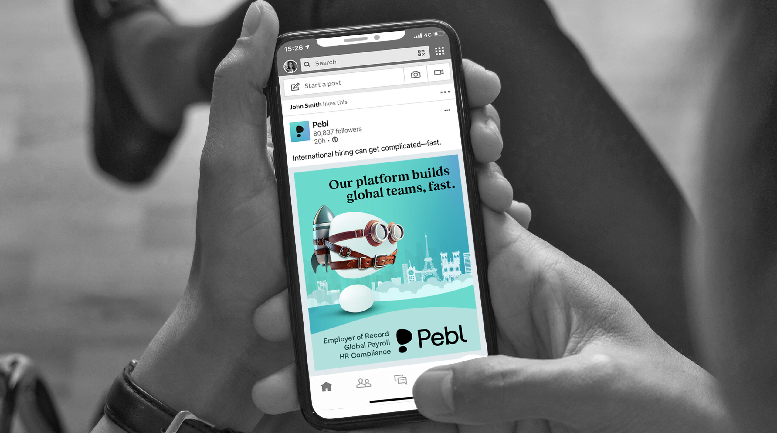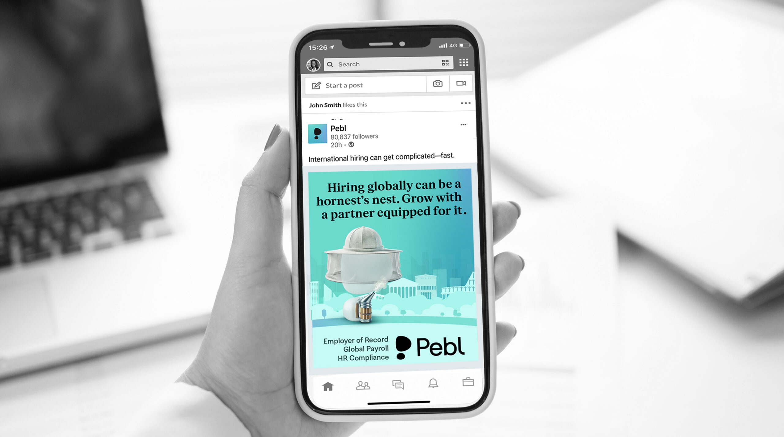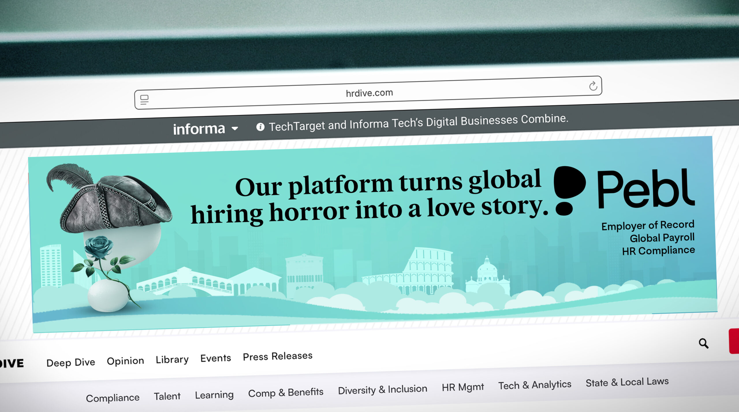 CHALLENGE: Pebl needed to make a big “splash” in the HR space. We needed to build awareness among HR leaders navigating the complexity of hiring across borders. With compliance, payroll, and employment regulations varying by country, global hiring can quickly become overwhelming. The objective was to drive qualified leads while positioning Pebl as the modern and easy way for companies to hire and manage talent worldwide.